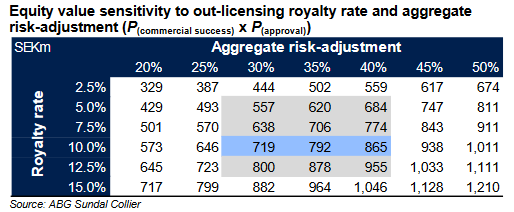 100% todennäköisyydellä tuosta tulisi nykyinen markkina-arvo 2 176,96 MSEK, jos rojaltien koko pysyy paremmalla puolella.