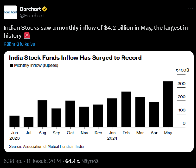 Exit polleissa Modille hyvä tulos; Modin selkeää voittoa ja jatkuvuutta tunnutaan pitävän positiivisena Intian osakemarkkinalle, jos näin tosiaan kävisi. Toki perjantaisen positiiviseksi kääntyneen jenkkimarkkinan takia luulisi myötätuulta maanantaina tulevan joka tapauksessa ellei ihmeellistä uutta. Tiistaina lie sitten vaalitulos tiedossa. Bloombergilla maksumuuri takana tänään 2.6. juttu, ei myöskään suostu kopioimaan linkkiä mutta löytynee helposti.