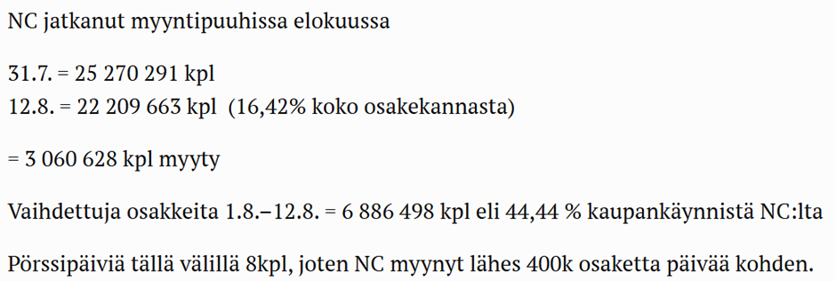- NC jatkaa edelleen myyntejään. NC myi jo ainakin 30 SEK:n tuntumassa, ja on selvästi päättänyt hankkiutua omistuksistaan eroon, joten miksi se ei myisi myös 50 SEK tienoilla, tai alempanakin. Ilman suurempaa omistajanvaihdosta tätä kasaa tullaan sulattelemaan vielä jonkin aikaa. En tiedä haluaako kukaan edes ostaa tätä ennen kuin pystyy tyhjäämään koko NC:n pajatson, koska jäljelle jääneet osakkeet tulevat mahdollisesti aiheuttamaan taas myyntipainetta.