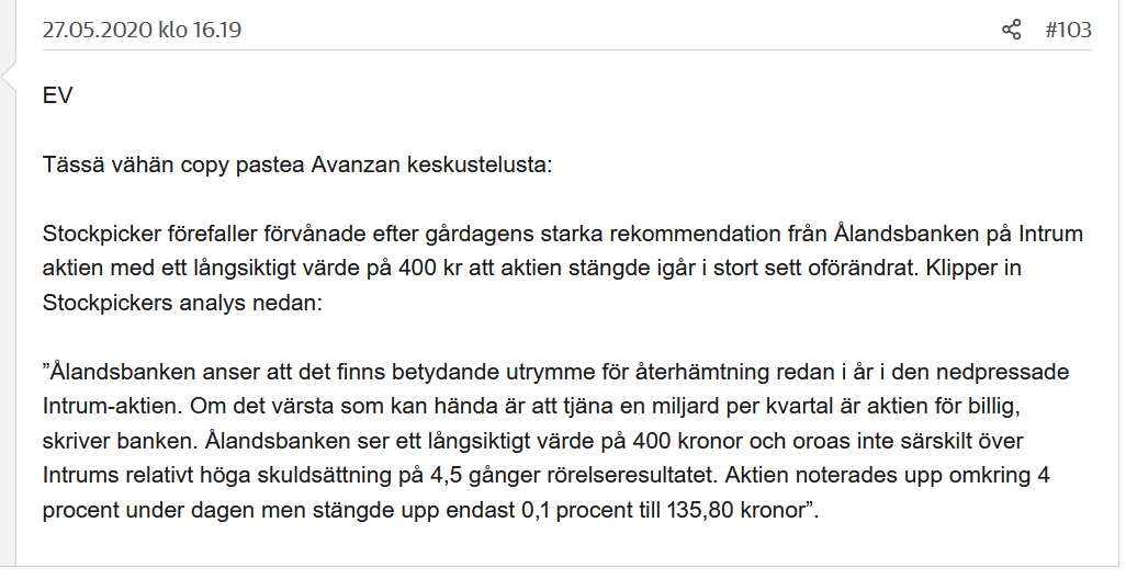 Edit2: Innehållet i mitt meddelande var kanske mer observationer om vart kursen kan vara på väg. Dessa är värda att följa om man lägger till eller gör en entré i Intrum.