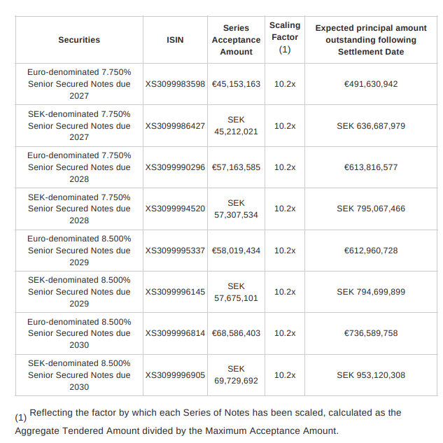Following the Offers, the Issuer will accept for purchase validly tendered Notes up to the Maximum Acceptance Amount, at a price of 94.4% of nominal value for each series of Notes, corresponding to an aggregate purchase price (excluding accrued and unpaid interest) of €216,102,920.80 and SEK 217,048,584.22, respectively.”