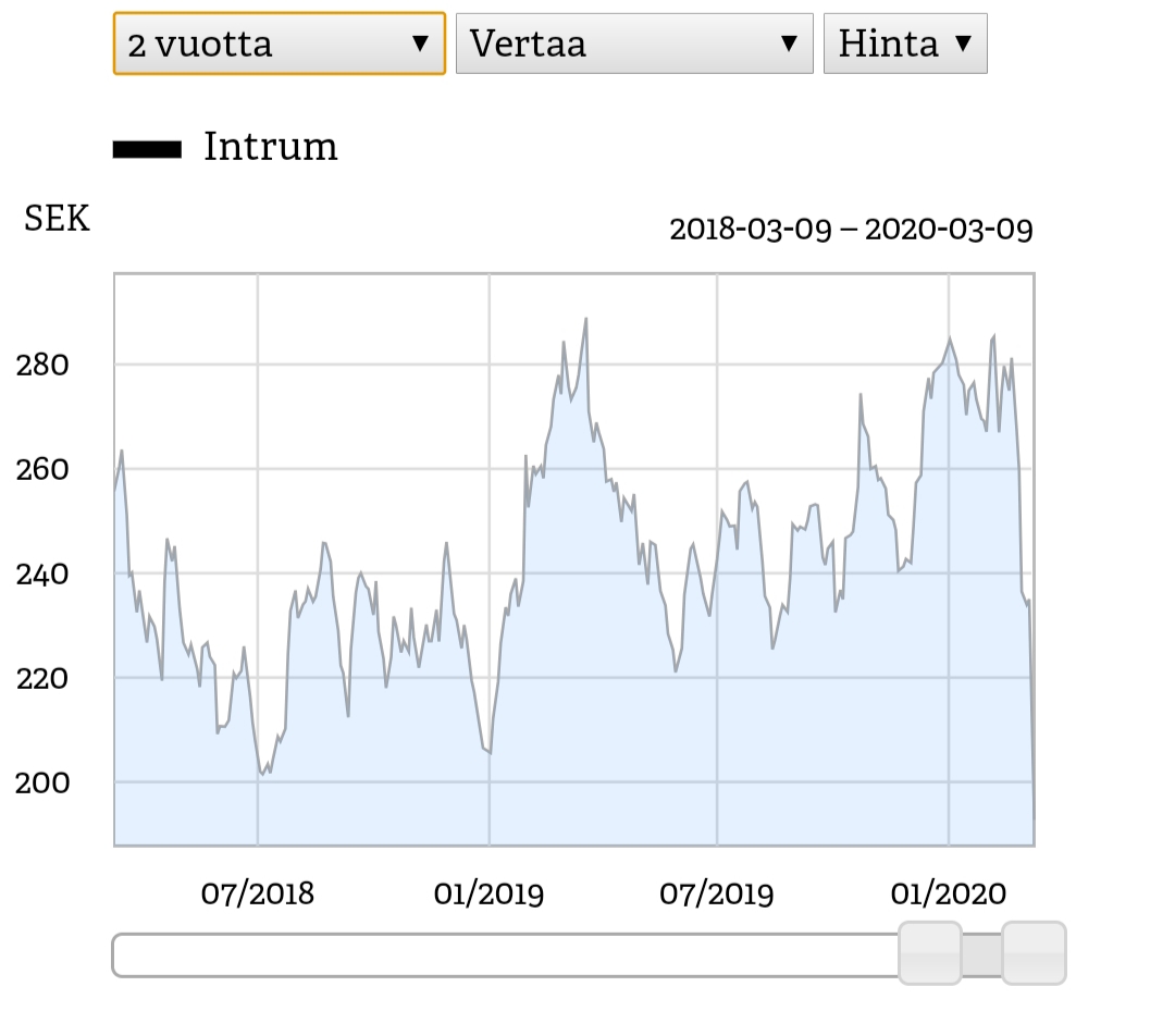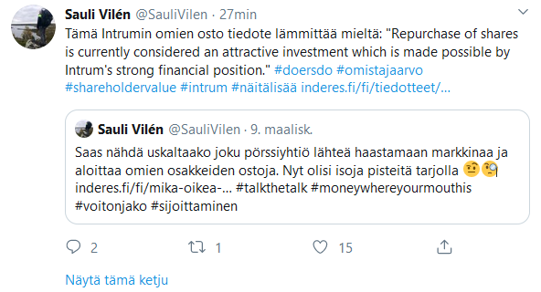 Det bekymrer mig dog en smule, at Sampo trak sig ud af aktien i løbet af februar. Ved storaktionæren mere end os? På den anden side formåede Mirko at berolige lidt ved aktieaftenen i Tampere, da han fortalte, at Intrum kun var en finansiel investering og ikke engang et forsøg på at opbygge en større ejerandel (nurkata). Men på den anden side, nu hvor prisen er næsten 100 kroner lavere, hvorfor så ikke?
