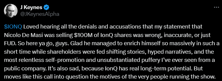 Tviitissä kerrotaan, että IonQ:n toimitusjohtaja Nicolo De Masi myi noin 100 miljoonan dollarin arvosta osakkeita eli lähes 80 % omistuksestaan ja vain kolme kuukautta sen jälkeen, kun hän oli laatinut kahden vuoden mittaisen virallisen myyntisuunnitelman. Ainakin tuolla X:ssä myyntien nopeus ja ajoitus herättävät kysymyksiä johdon motiiveista, vaikka tviittajien mukaan yhtiöllä on selkeää pitkän aikavälin potentiaalia.