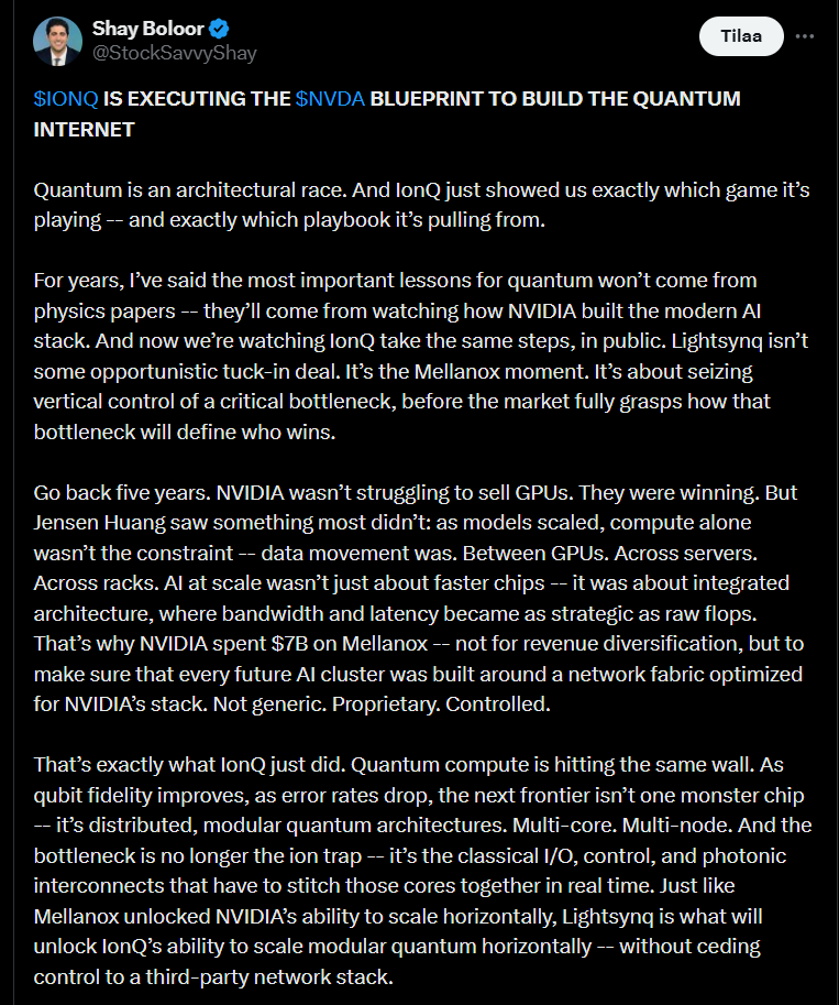 Tviitissä todetaan, miten IonQ rakentaa kvanttialustan samalla strategialla kuin NVIDIA rakensi tekoälyklusterinsa. Yhtiö ei keskity pelkästään parempiin kvanttisiruisiin, vaan koko arkkitehtuuriin esim. miten kvanttidata liikkuu, skaalautuu ja yhdistyy laskentaan. Lightsynq-hankinta muistuttaa Mellanox-kauppaa eli kyse on tviittajan mukaan kriittisen pullonkaulan hallinnasta ennen kuin markkina tajuaa sen merkityksen.