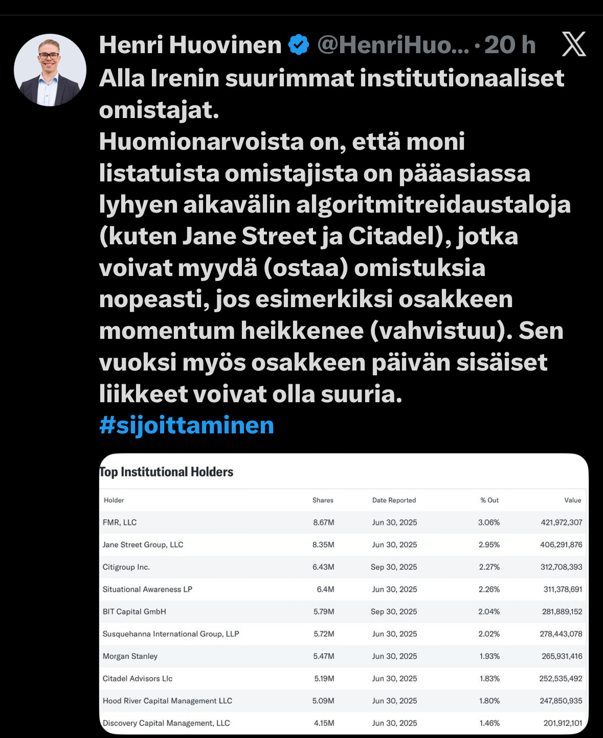 This too might be good for Iren investors to know. I can say frankly that many large investors are not ‘very thrilled’, especially about Jane Street’s lively investment pot.