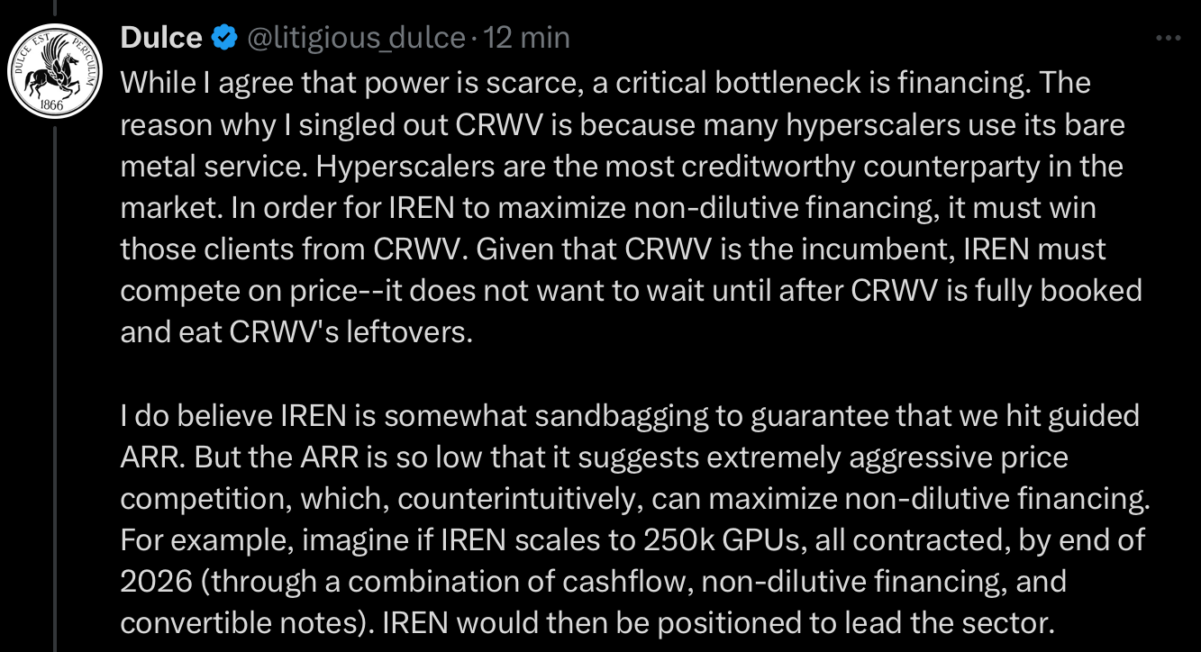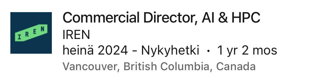 $1M-1.3M ARR/MW? Ja koska yhtiötä halutaan niin kovasti verrata Nebiukseen niin mainitaan että Nebius on ohjeistanut $900M-1.1B ARR loppuvuodelle ja 220MW sähköä.