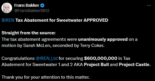 600k verohelpotuksia vahvistettu Sweetwater 1&2 osalta ![]()