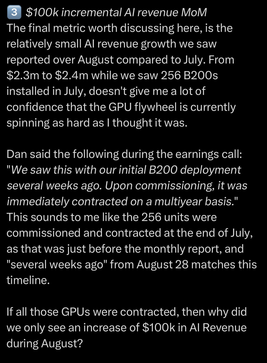 If AI proves to be a bubble, IREN could face revenue shortfalls, stock price corrections, and financing challenges, particularly in its AI cloud segment. However, its high data center margins (97–98%), driven by low-cost renewable energy and liquid-cooled infrastructure, provide a competitive edge that could help it maintain profitability and capture market share in a downturn. Its Bitcoin mining operations offer a financial buffer, reducing reliance on AI revenue. While margins matter, their effectiveness depends on sustained demand and IREN’s ability to secure clients. Long-term, IREN’s energy efficiency and strategic partnerships position it to benefit from AI’s growth post-correction, but near-term risks from overvaluation and market volatility remain.