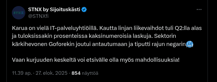 Kukkaron nyörit ovat tiukemmalla joka paikassa, mutta ei se maagisesti muutu AI-loikaksi ja tai tee asiakkaista parempia IT-johtajia tai anna budjetteja palkata niitä huippudevaajia omille listoile. Jos yhtään tuntee Suomen suuryrityskenttää, niin tietää, että kylllä siellä on digitalisaation kanssa tehtävää ja paljon, eikä jatkossakaan kaikki tule tapahtumaan vain inhouse-tekijöillä.