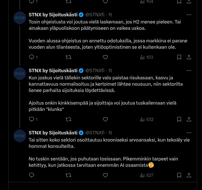 Mä jotenkin ajattelen, että näissä nyt tapahtuvissa tuntihintojen tippumisissa ja muutosneuvotteluissa on enemmän normaalia markkinan syklisyyttä kuin sitä, että AI olisi näin nopeasti transformoinut markkinan, tai että asiakkaiden ostokäyttäytyminen olisi pysyvästi muuttunut täysin erilaiseksi ja kaikki tehdäänkin talon sisällä.