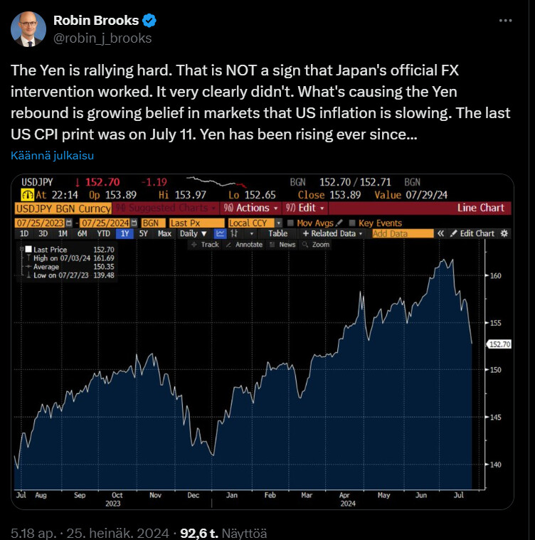 Jeni vahvistuu merkittävästi, mutta se ei johdu tviitin mukaan Japanin keskuspankin virallisista valuuttainterventioista, jotka eivät selvästi toimineet.