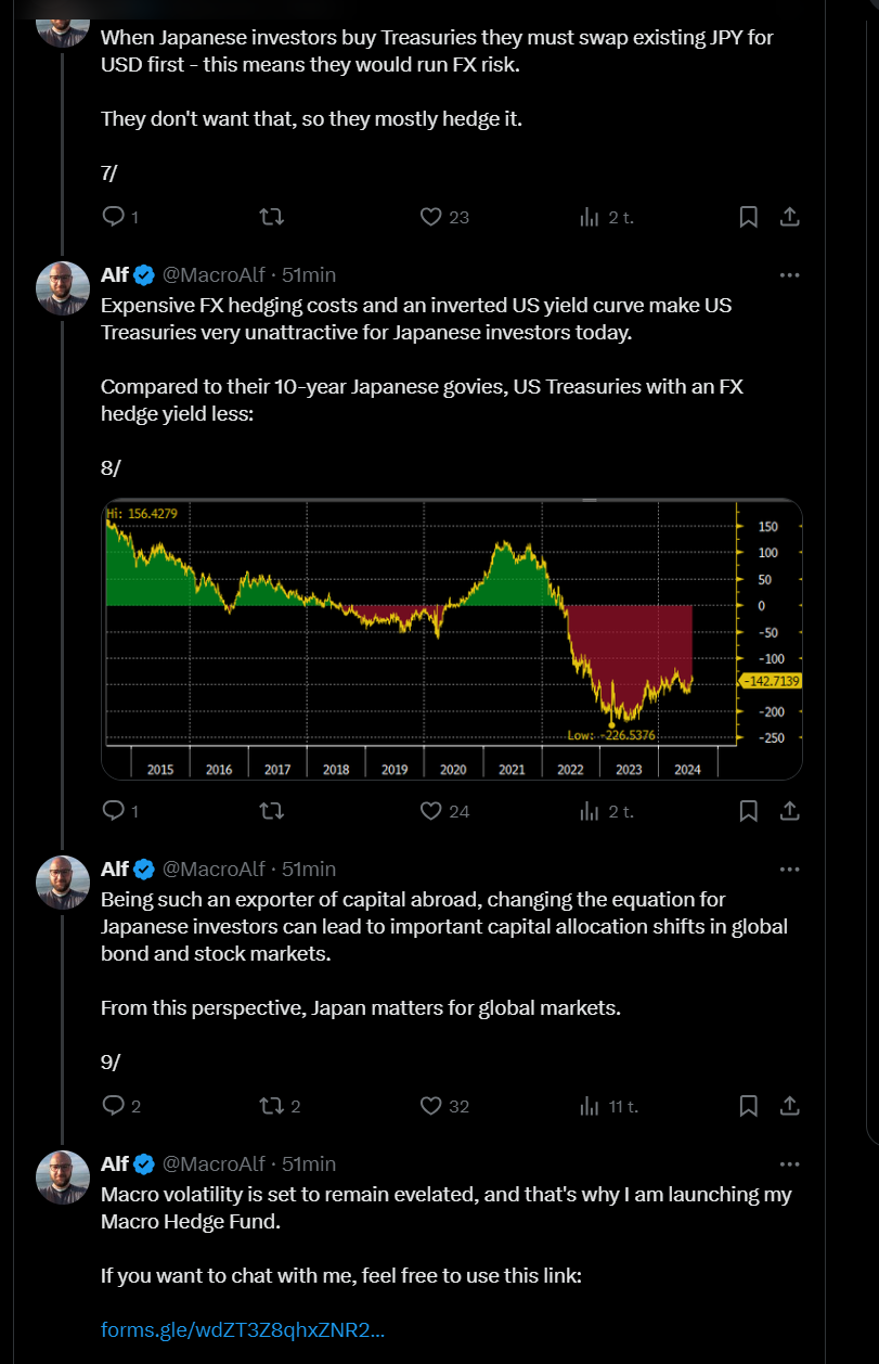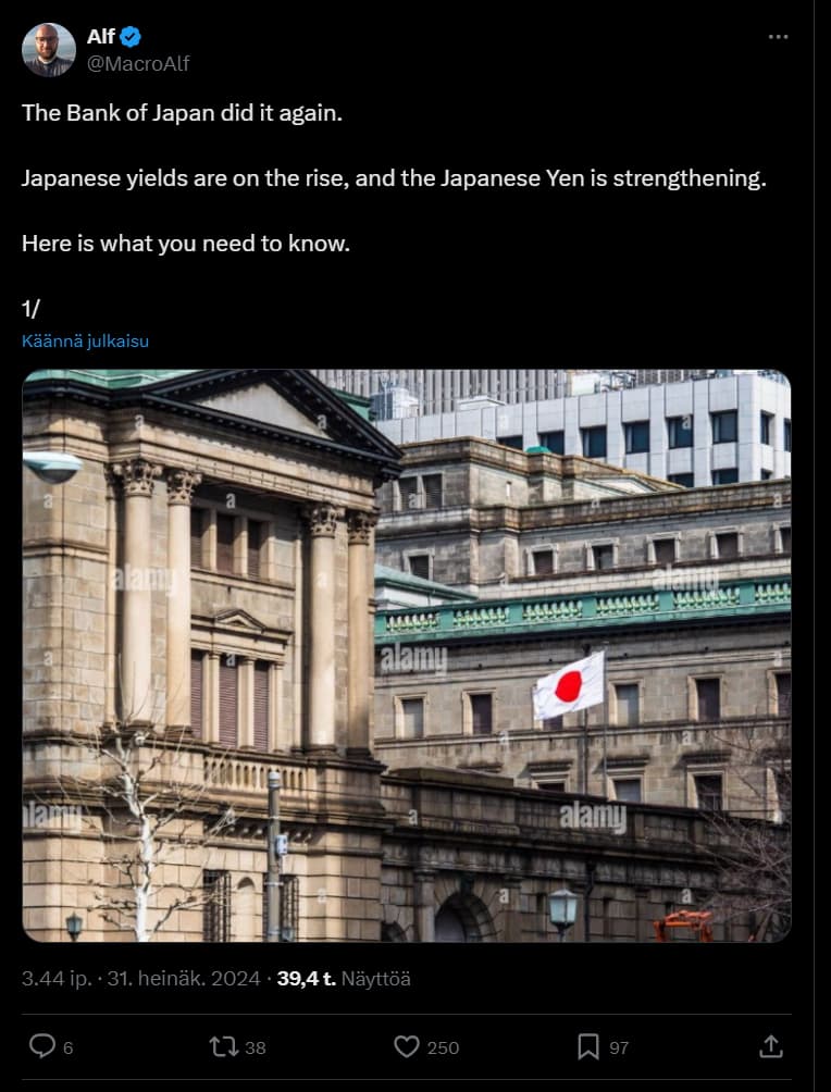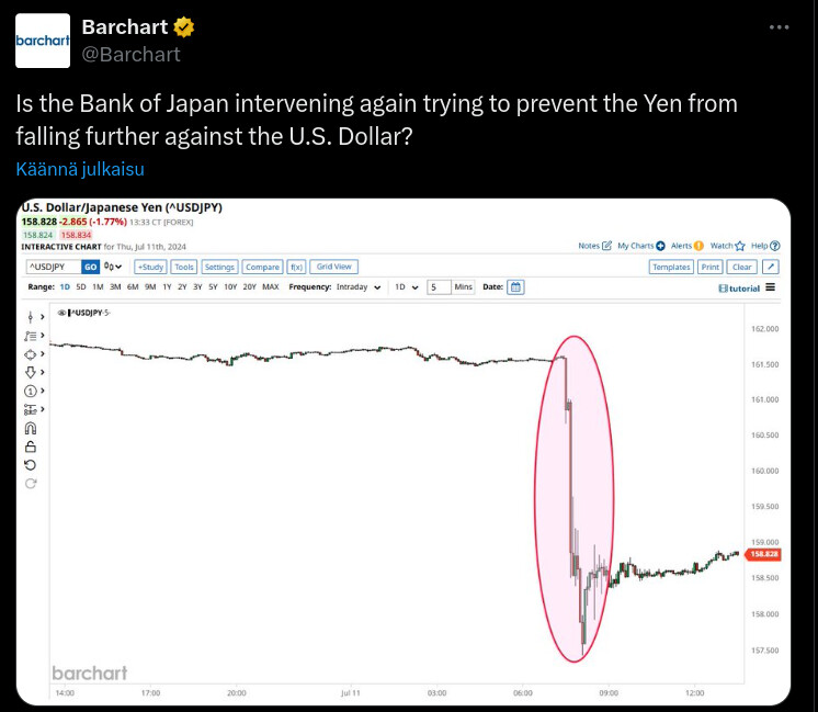 Alla olevassa tviitissä pohditaan, onko Japanin keskuspankki jälleen kerran puuttumassa markkinoihin estääkseen jenin arvon laskun suhteessa Yhdysvaltain dollariin. Tästä voi olettaa, että Japanin keskuspankki saattaa ryhtyä toimenpiteisiin valuuttakurssien vakauttamiseksi, mikä voisi sisältää valuutan ostamista tai myymistä suoraan markkinoilla tai muita poliittisia toimia.