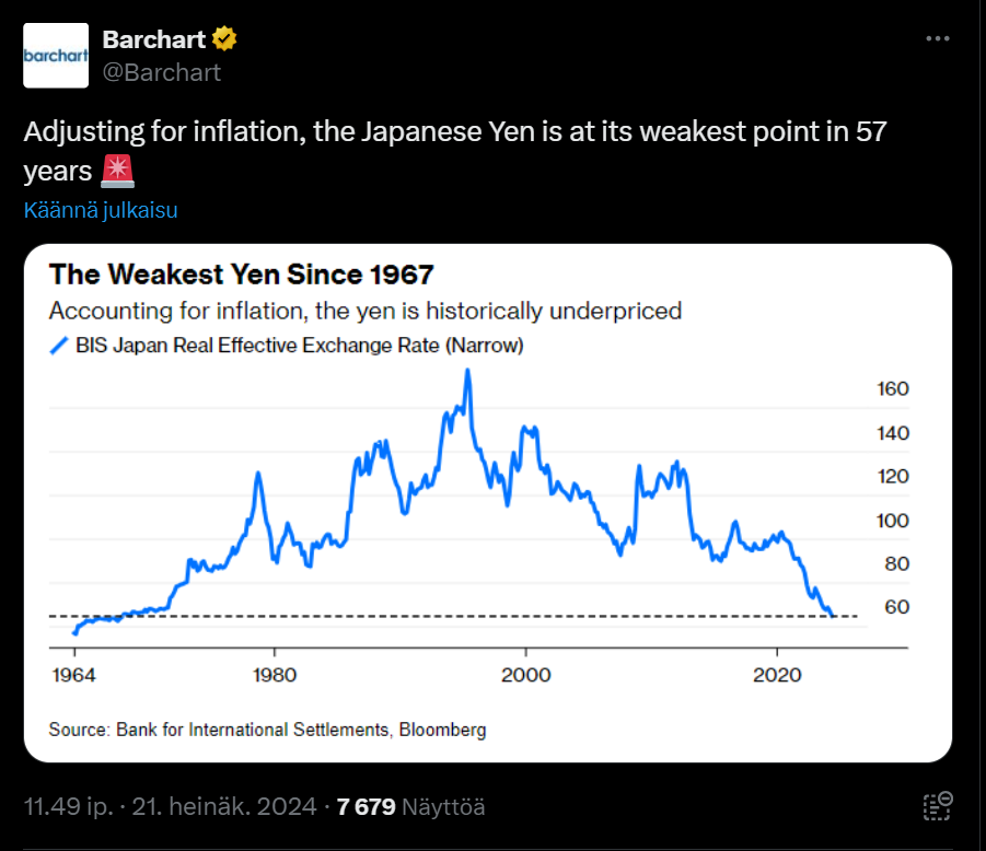 Toinen huomio on että jeni on lähellä all time low tasoja. Heiluri saattaa siis heilahtaa jossain kohtaa taas toiseen suuntaan
