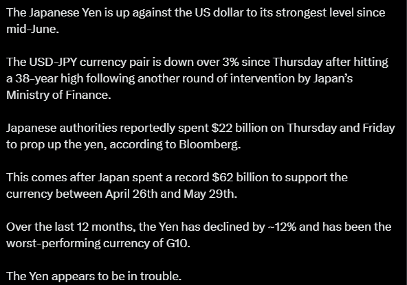 USD-JPY-valuuttapari on laskenut yli 3 % torstaista, kun Japani puuttui jälleen valuuttapeliin omilla toimillaan. Maa käytti noin 22 miljardia dollaria torstaina ja perjantaina jeniä tukeakseen. Huhtikuun ja toukokuun välillä Japani käytti ennätykselliset 62 miljardia dollaria valuutan tukemiseen.