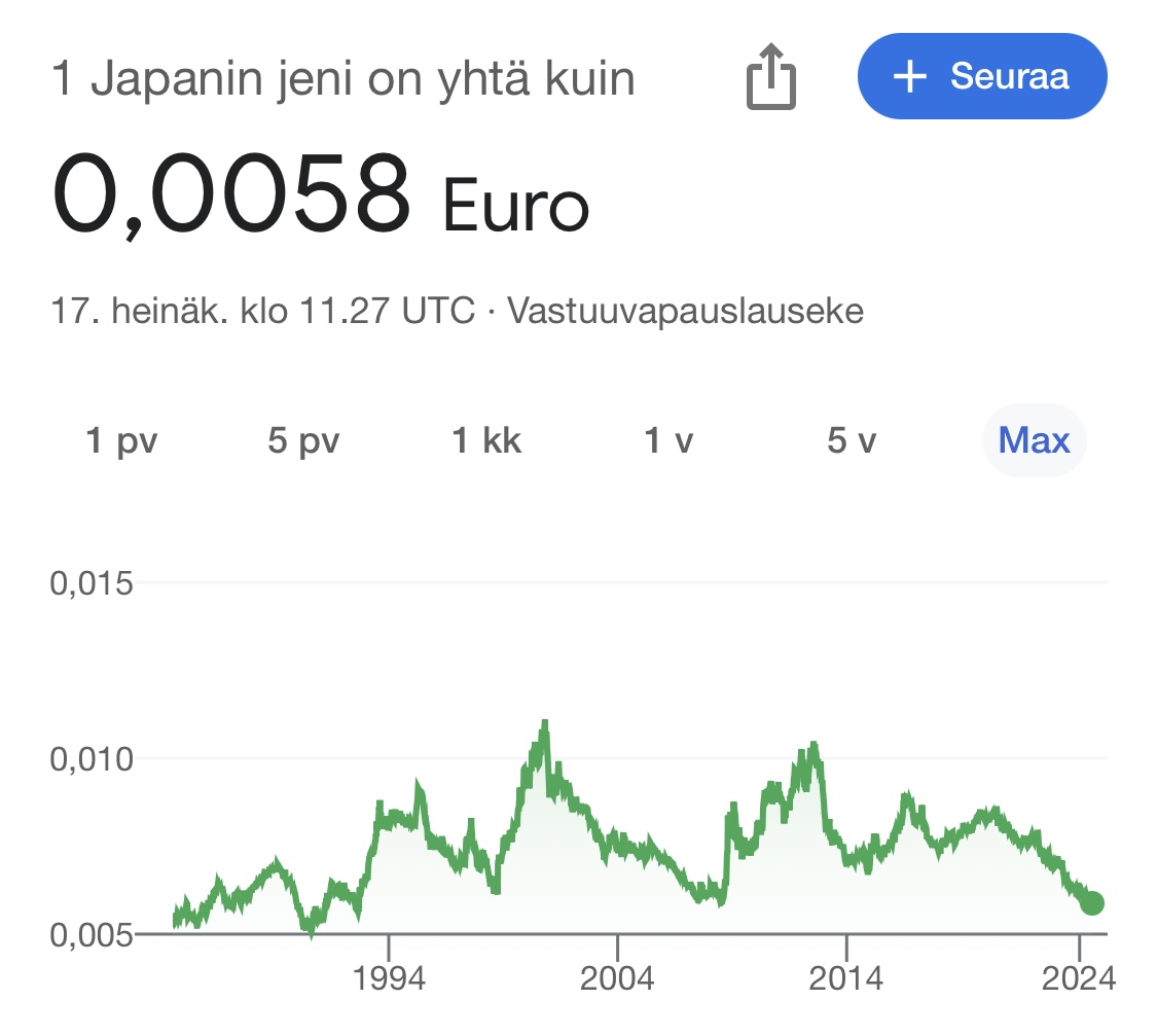 Lisäksi paljon keskustellaan jenin heikkoudesta. Näen sen kolikon heittona, joko heikkenee tai vahvistuu. Valuutat hinnoitellaan markkinoilla äärimmäisen tehokkaasti joten omalla analyysilla vaikea saada informaatioetua.
