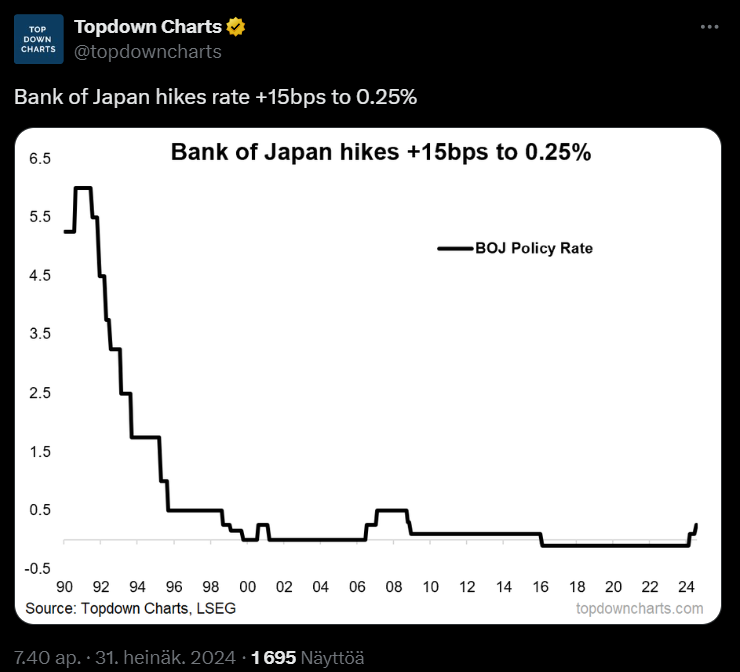 Viitaten ketjun otsikkoon, todellakin nousevan ja laskevan pörssin maa tällä hetkellä Keskiviikkona +4%, eilen saman verran alas ja sama suunta näyttäisi olevan tänään, melkoisia päiväliikkeitä. Ja kaikki johtunee Japanin keskuspankin korkopäätöksestä?
