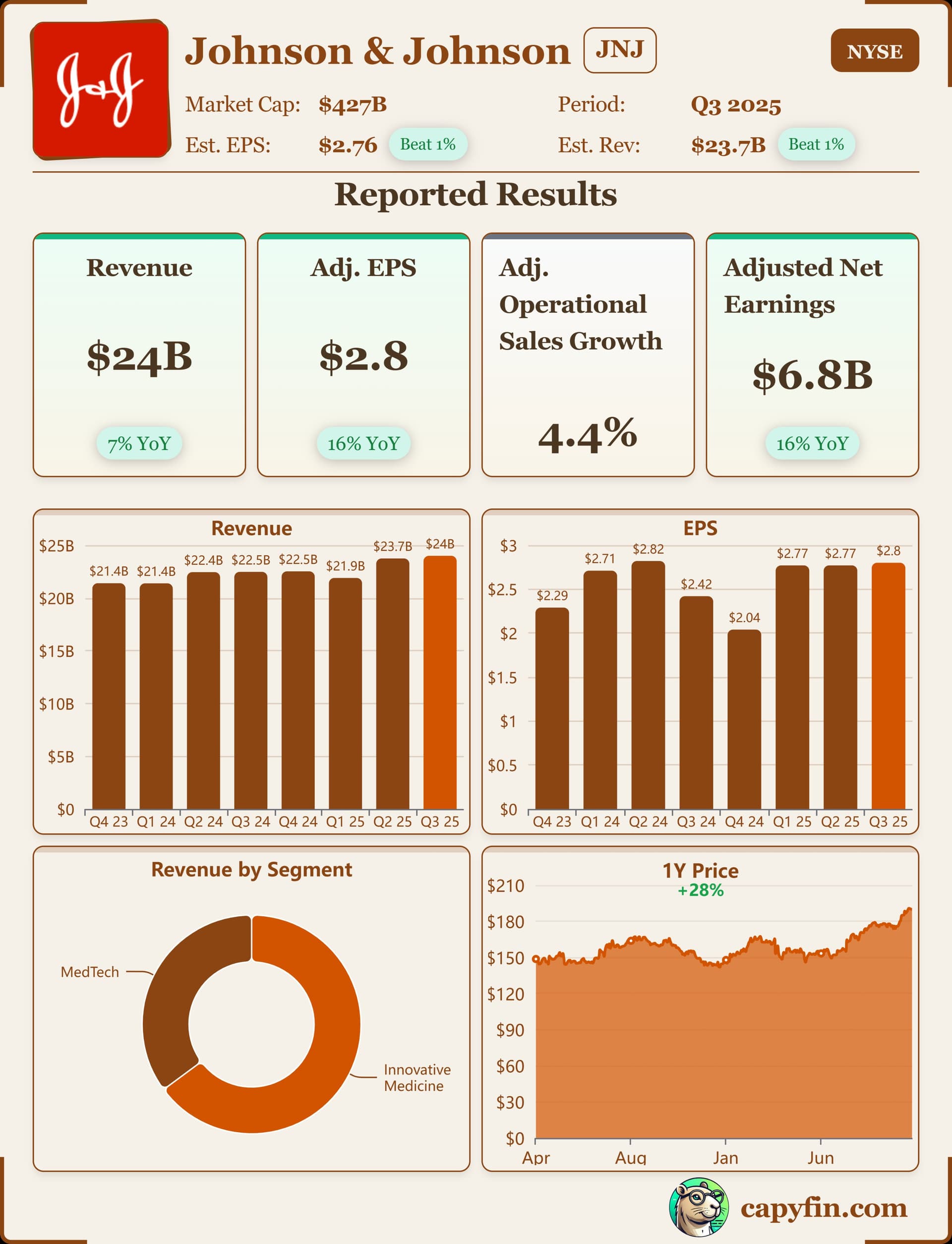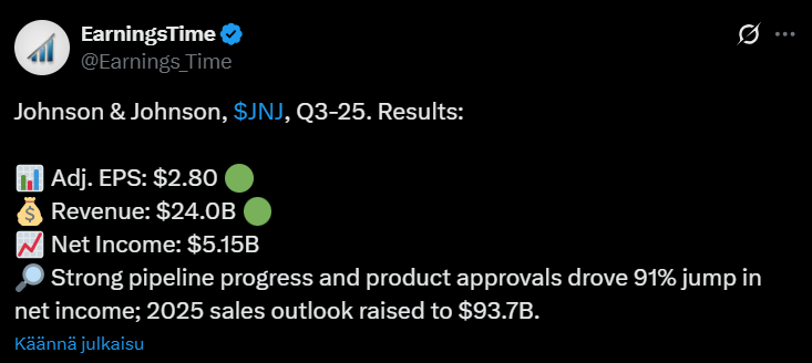 Johnson & Johnsonin kolmas neljännes sujui hyvin; liikevaihto ja tulos ylittivät odotukset, lisäksi yhtiö nosti näkymiään tälle vuodelle. Sekä lääkepuoli että lääkintälaitteet kasvoivat reippaasti ja myös tulos parani selvästi viime vuodesta.
