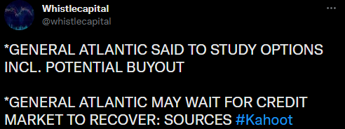 General Atlantic FT BV on 16. syyskuuta 2022 tehnyt sopimuksen SB Northstar LP:n, SoftBank Group Corp:n (”SoftBank”) 100-prosenttisesti suoraan omistaman tytäryhtiön hallinnoiman rahaston, kanssa ostaa kaikki SoftBankin osakkeet Kahoot! ASA:sta (”Yhtiö”), jotka koostuvat 73 500 000 osakkeesta ja edustavat 15,02 prosenttia Yhtiön liikkeeseen lasketusta osakepääomasta ja äänistä (”Transaktio”).