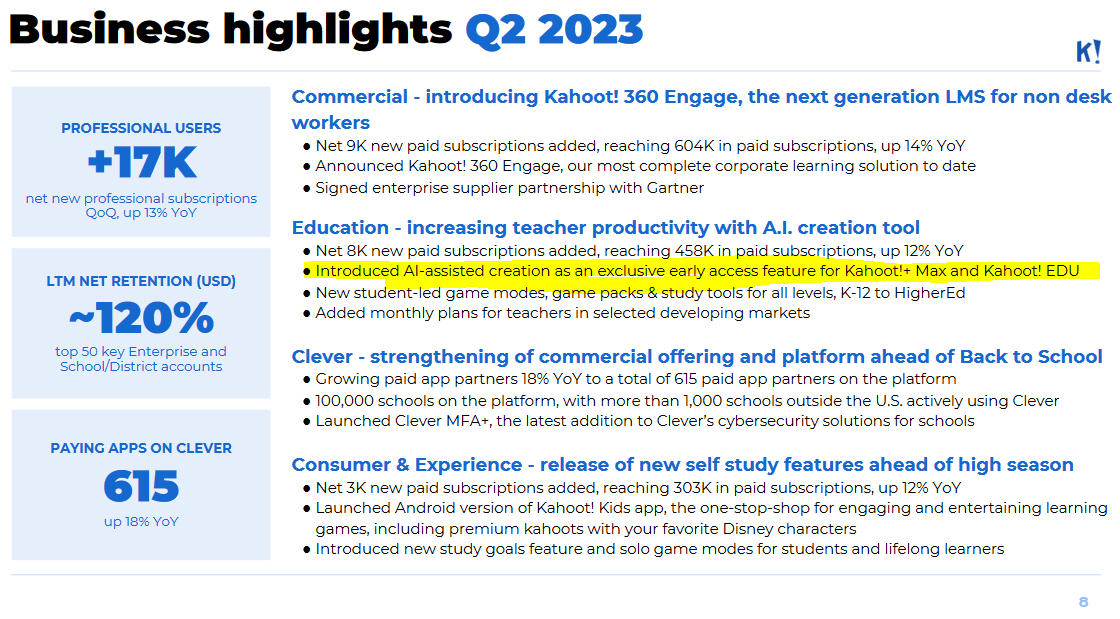Q2 2023-rapporten var utan överraskningar. Tillväxten under H1 var svag och under H2 förväntas en högre omsättning i linje med normal säsongsvariation. Omsättningen ökar i takt med att antalet betalande användare ökar. Å andra sidan minskar det totala antalet användare. Guidning och de långsiktiga målen är förstås oförändrade.