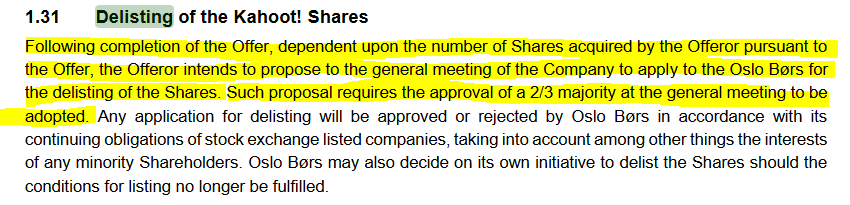 Following the completion of the Offer, subject to the closing conditions, the Offeror intends to make a mandatory offer to acquire the remaining Shares pursuant to chapter 6 of the Norwegian Securities Trading Act. If the Offeror becomes the owner of 90% or more of the Shares and voting rights in the Company, the Offeror intends to carry out a compulsory acquisition of the remaining Shares pursuant to section 4-25 of the Norwegian Public Companies Act and section 6-22 of the Norwegian Securities Trading Act.