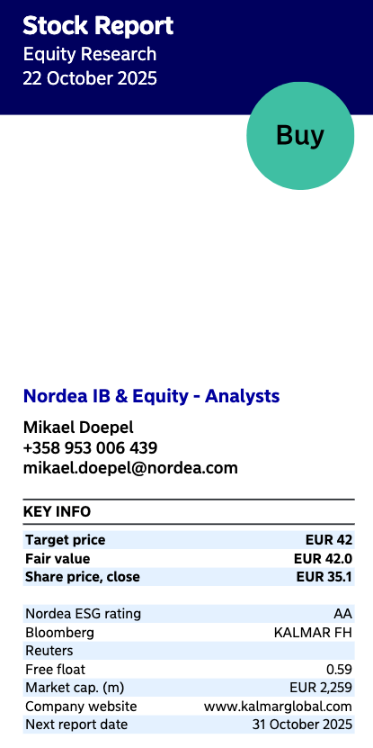 Toistamme Kalmarin lisää-suosituksen ja 39 euron tavoitehintamme. Yhtiön Q3-tulos ylitti hieman ennusteemme ennätystason marginaalin tukiessa kehitystä, kun taas tilaukset jäivät odotuksista syklisemmän laitepuolen vetämänä. Palveluiden kehitys oli sen sijaan laaja-alaisesti odotuksiamme vahvempaa. Yhtiön markkinakommentit olivat ennallaan, ja kysyntätilanne on jatkunut vakaana tai hyvänä Amerikan ulkopuolella. Kokonaiskuvaa peilaten ennustemuutokset jäivät vähäisiksi ja näemme osakkeen arvostuksen houkuttelevana pidemmän aikavälin suotuisiin tuloskasvunäkymiin peilattuna.