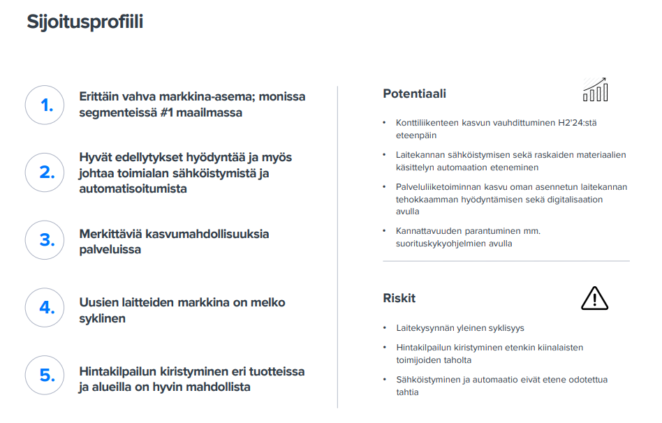 - Hiab, ajoneuvojen kuormankäsittelyn edelläkävijä, jolla on vahvat näytöt kannattavasta kasvusta sekä houkuttelevat mahdollisuudet yritysjärjestelyille.