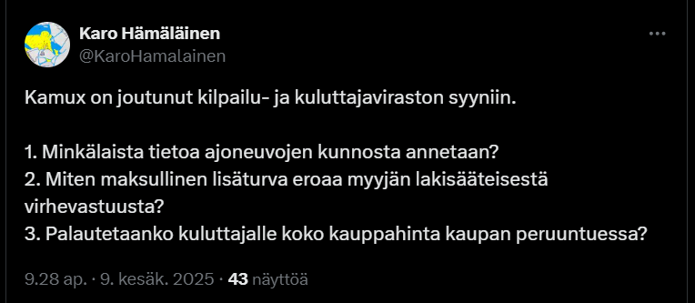 Tässäkin asiassa oma kilpailuetunsa, muutaku Kamux ottaa itseään niskasta kiinni ja parantamaan luotettavuuttaan ja yhteydenpitoa/vastuuta myös autokauppojen jälkeen.