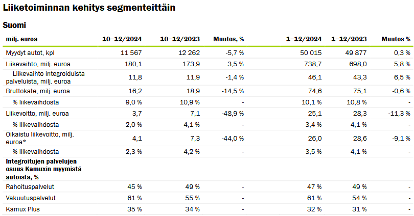 2024 EBIT Saka +12 MEUR Kamux Suomi oikaistuEBIT +26 MEUR, vähemmän oikaistu +25,1 MEUR. Kamux Suomella menee ihan kivasti, ulkomaat painaa.
