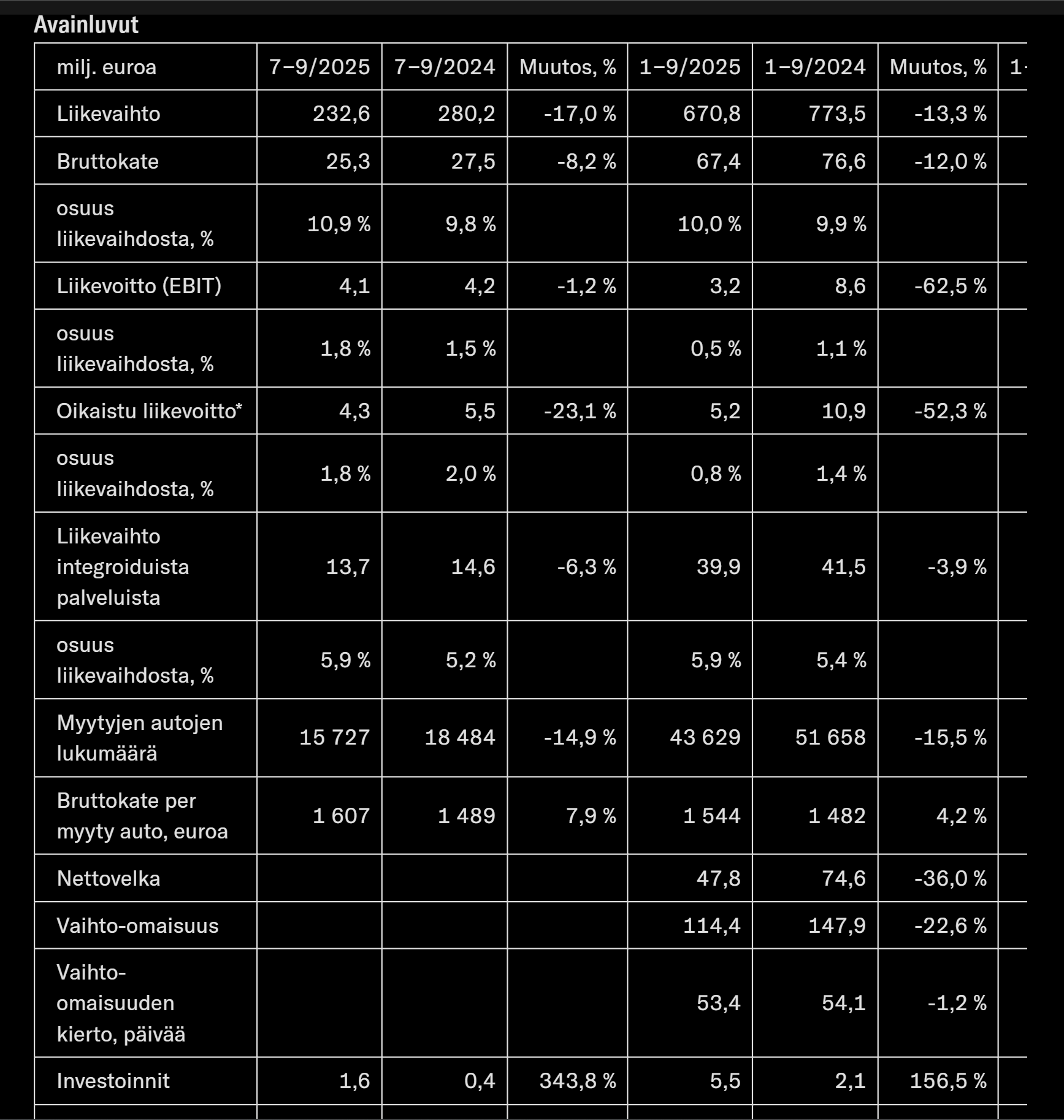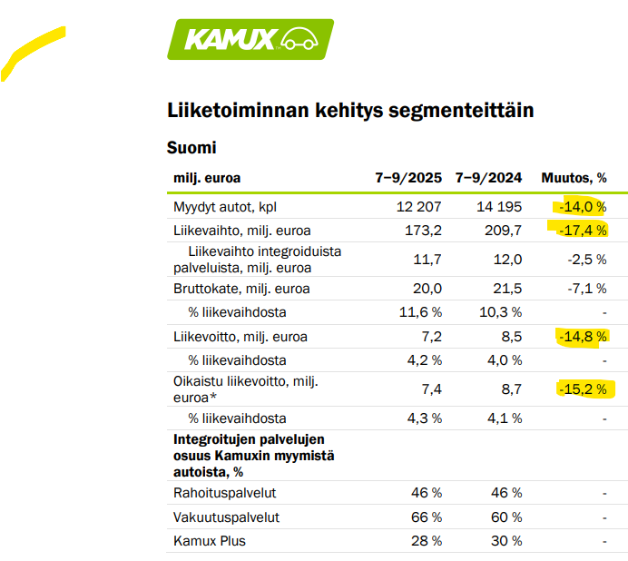 Joo Suomen liikevaihdon lasku on mennyt läpi alimmalle viivalle saakka, eli ei ole bisnes kääntynyt parempaaan yhtään Q3. Kulukuurin Kamux tarvitsee, ehkä Pajuharjun lähtö on pieni kulujen laskua tuova tapahtuma, vaikka ehkä kultainen kädenpuruistus on vielä kallis 2025.