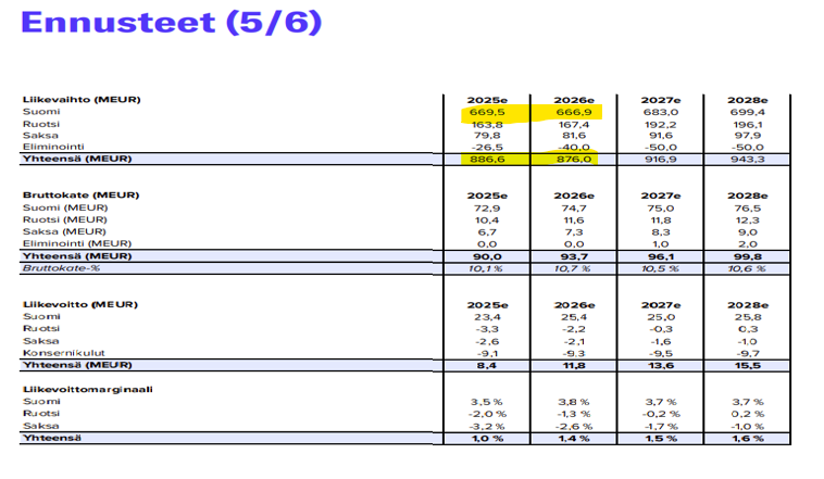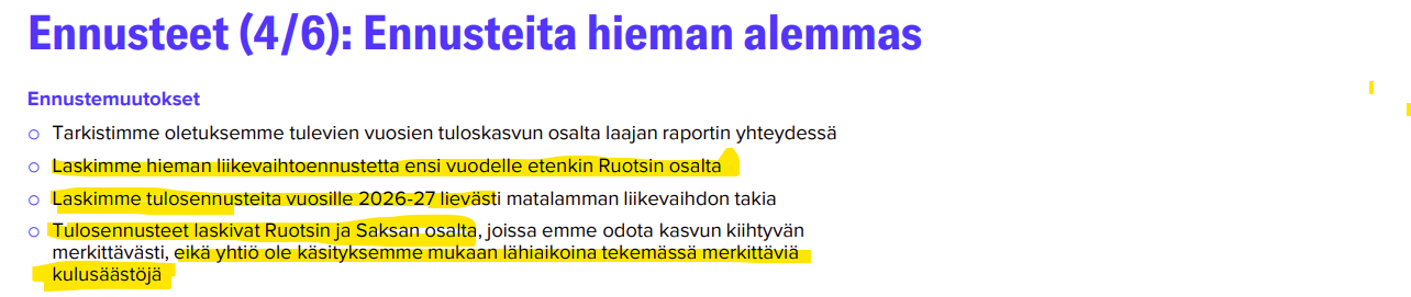 We also lowered our forecasts for 2026-27. This was influenced by a small decrease in the average car price forecast in Finland and, consequently, the forecast for integrated services. Due to Finland’s large absolute profit, their decrease weighed most heavily on the group’s forecasts. For Sweden, we raised our gross margin assumptions. However, we had previously expected store closures and thus clear cost savings, which do not seem to be materializing. Consequently, our fixed cost forecasts for Sweden increased. Overall, Sweden’s forecasts rose slightly, but the adjusted operating profit remains in the red for 2026-27. There were no significant changes to Germany’s forecasts, and we assume losses in the coming years as well.