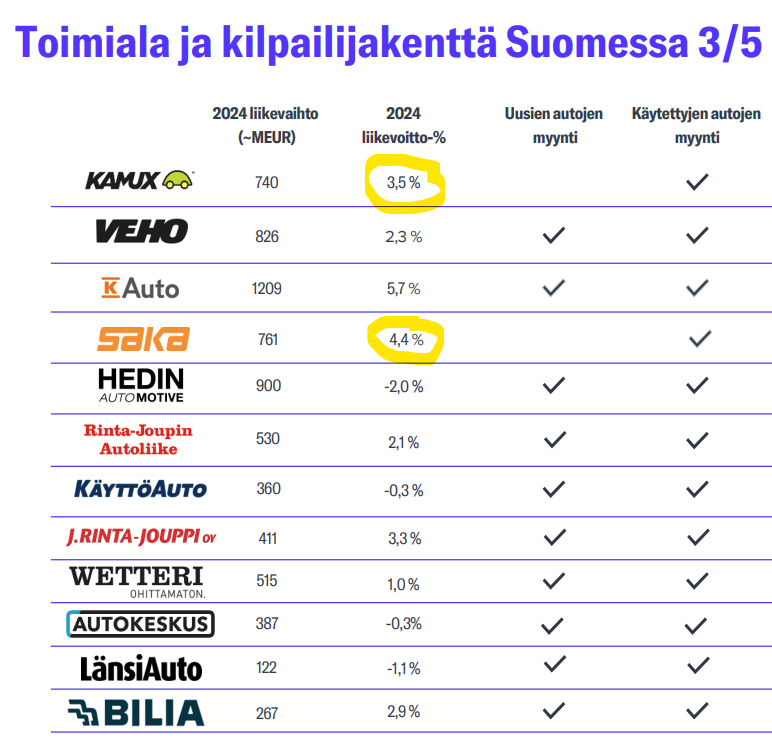 I also looked at Kamux’s Q3 materials, interviews, etc., and this is a classic case of running aground and being in a deadlock. I have encountered the exact same thing in my own professional life. That is, someone far from the customer interface decides that the margin (usually some margin percentage or unit price) will be significantly adjusted and an overly challenging target is set. The end result is that the topline suffers, and then both the margin and operating profit in euros decrease when deals are not made due to poor price competitiveness. Fixed costs continue their course, and in Kamux’s case, there are simply more of them per completed car sale.