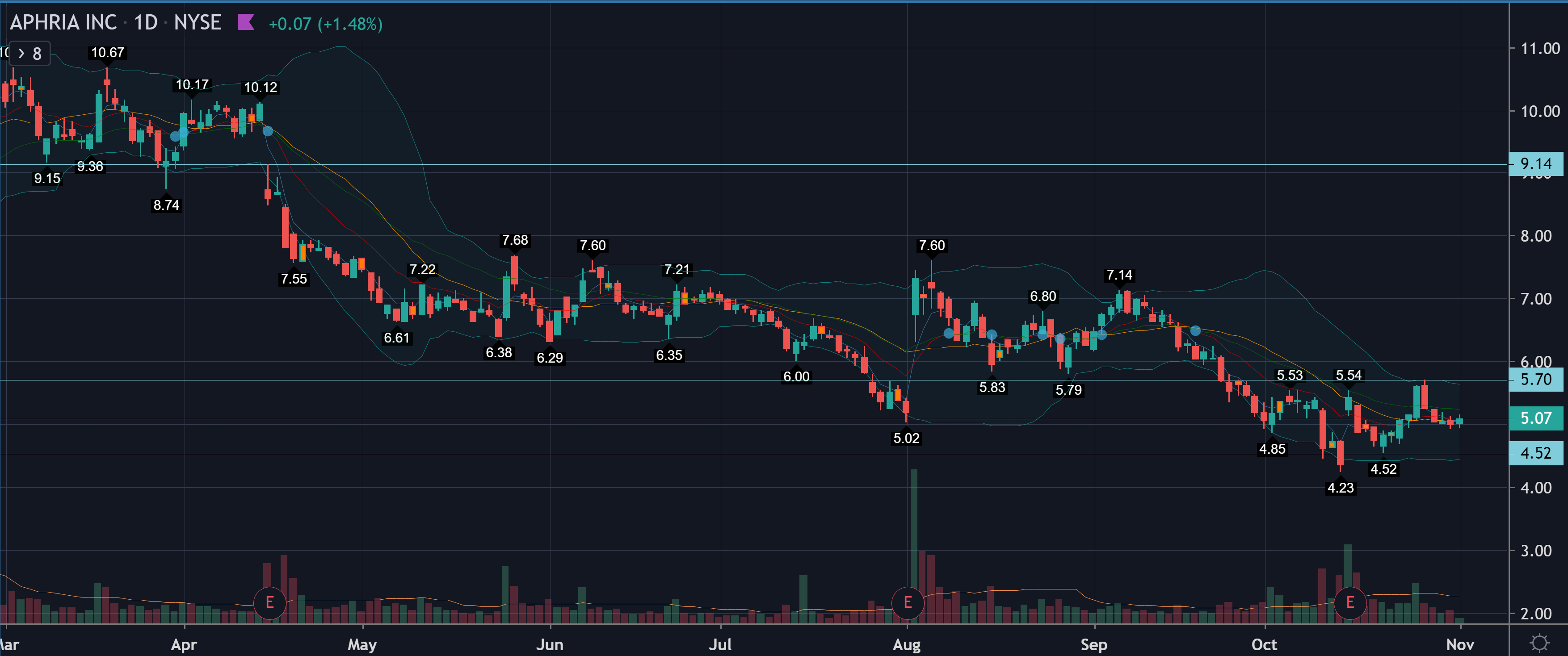 On a daily level, APHA is actually one of the strongest, as it has made an upward reversal, while others are still struggling with it. However, CGC is the market leader, so others tend to follow its price reactions quite strongly.