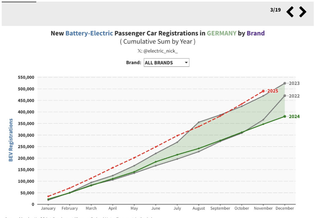 “Euroopan sähköautojen (BEV) rekisteröinnit ovat kokeneet voimakkaita muutoksia viime vuosina: vuosi 2023 oli vauhdikkaan kasvun aikaa, mutta vuonna 2024 kasvu hidastui tai jopa pysähtyi monilla markkinoilla (kuten Saksassa) ostotukien poistumisen seurauksena, vaikka EU:ssa rekisteröitiin silti yli 1,4 miljoonaa uutta BEV-autoa. Tänä vuonna 2025 markkinat ovat palautuneet vahvaan nousuun: tammi-lokakuun aikana Euroopassa (EU+EFTA+UK) on rekisteröity 2,02 miljoonaa uutta BEV-autoa. Tämä määrä merkitsee 26,2 %:n kasvua verrattuna edellisvuoden vastaavaan jaksoon ja nostaa BEV:n markkinaosuuden uusien autojen kokonaismäärästä 18,3 %:iin.”