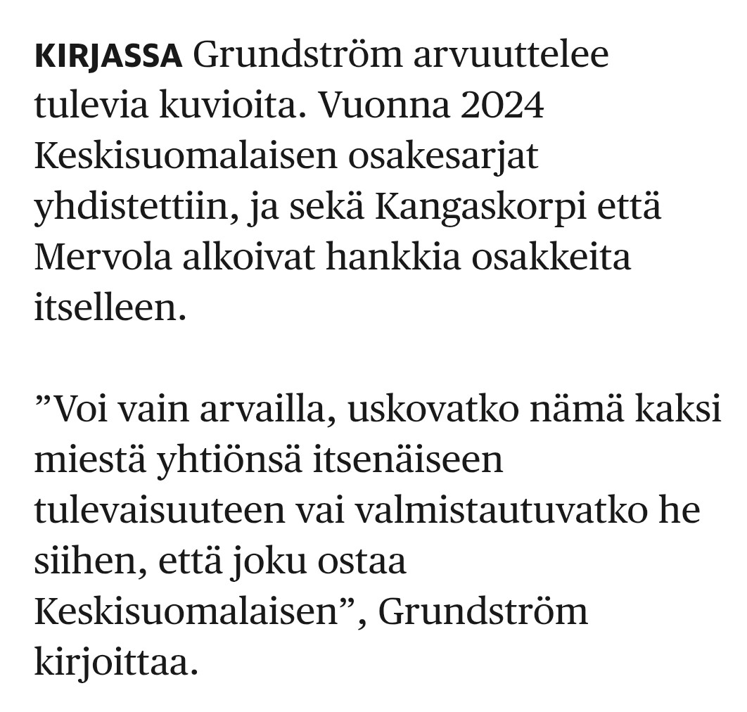 Der kræves naturligvis også en sælger, og ejerskabet af Keskisuomalainen er meget stærkt spredt. Selvom Kangaskorpi og partnere skulle finde en passende køber, er det slet ikke sikkert, at en tilstrækkelig stor del af de nuværende ejere er villige til at sælge. Når det drejer sig om en branche, hvor andre værdier end dem, der er forbundet med maksimering af formue, er vigtige, tør jeg endda vædde på, at det er yderst udfordrende at opnå 90% godkendelse fra ejerne. Eller i det mindste kan jeg ikke umiddelbart komme i tanke om en passende køberkandidat.