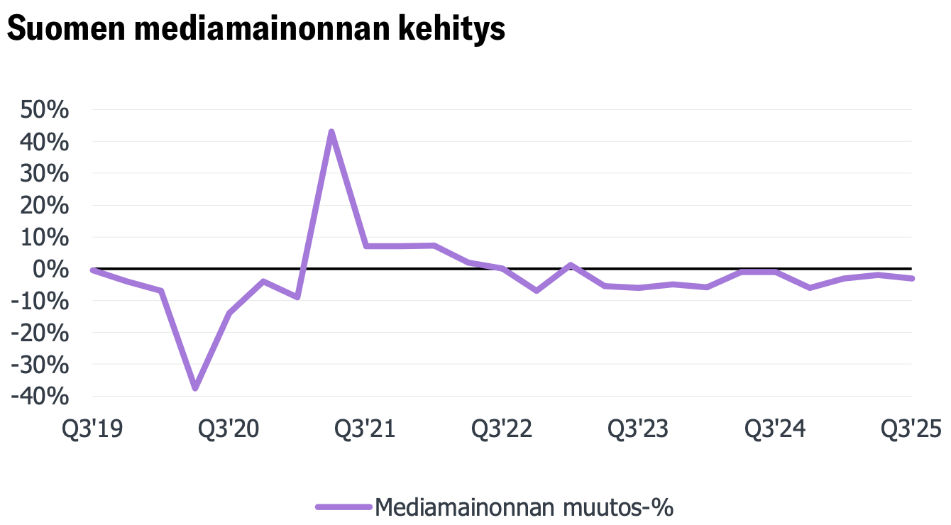 Ifølge statistikker udgivet af Kantar faldt mængden af medieannoncering i Finland i november med 4 % i forhold til sammenligningsperioden. Dermed er den kumulative udvikling for hele indeværende år nu godt 2 % negativ (1–11/2025: -2,4 %).