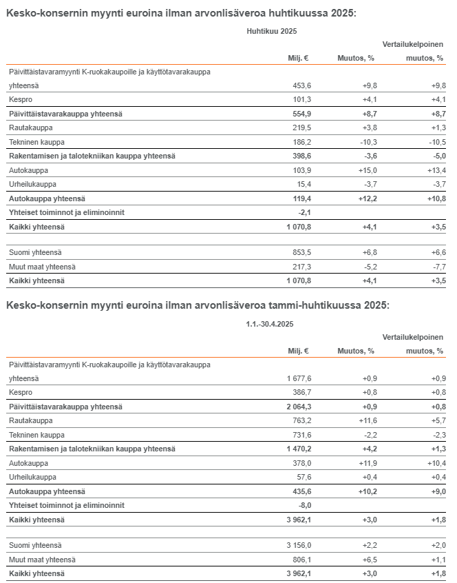 Kesko Group’s sales in April 2025 totaled €1,070.8 million, growing by 4.1%.
