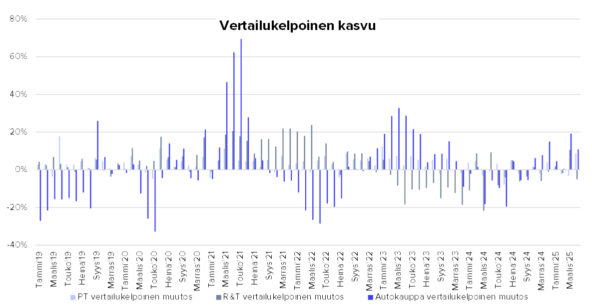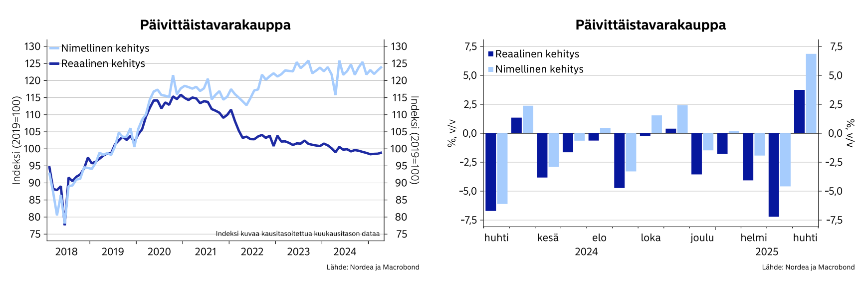 The growth in the grocery trade reflects the shift of Easter from March 2024 to April 2025. However, market growth is not solely explained by this, as April had one less delivery day compared to the reference period. Kesko stated in connection with its Q1 report that the impact of Easter on the growth percentage would be in the range of 3-3.5%.
