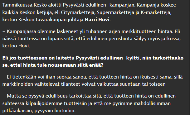 If this practice is true, Kesko might be playing with consumers’ trust, as well as the credibility of the Kesko brand and price campaign.