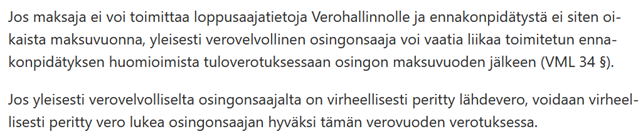 Suomalaisen yhtiön maksamasta osingosta pidätetty lähdevero merkitään veroilmoitukselle ennakonpidätykseksi samalla kun osinko ilmoitetaan tulona.