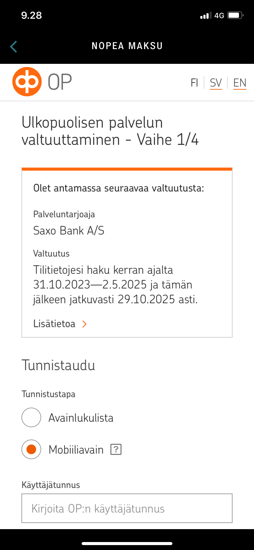 Olet hyväksymässä valtuutusta, jolla Saxo Bank A/S saa hakea tilitietojasi kerran ajalta 31.10.2023—2.5.2025 ja tämän jälkeen jatkuvasti 29.10.2025 asti.