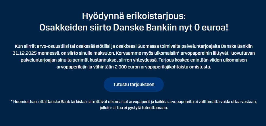 Prislisten er uden medlemsfordele lidt pebret med administrationsomkostninger, men som medlem af f.eks. Finlands Aktiesparere (Suomen Osakesäästäjät) tilbydes gratis opbevaring samt et handelsgebyr på maksimalt 0,12 % / min. 5€ for alle aktier. Det slår ikke Nordeas min. 1 % prissætning, men et acceptabelt alternativ. Derudover har Danske Bank i hvert fald tidligere (seneste information 2023) betalt renter til handelskontoen 3 måneders Euribor -0,5 %, men jeg kunne ikke finde på deres hjemmeside, om dette stadig er g