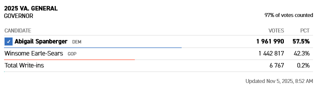 Lähde: https://www.politico.com/news/2025/11/04/spanberger-wins-virginia-governors-race-00633606