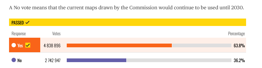 Kaliforniassa äänestettiin Proposal 50 läpimenosta, joka läpi mennessään mahdollistaisi äänialueiden uudelleenmuodostamisen väliaikaisesti demokraattiedustajien maksimoimiseksi ensi vuoden edustajainhuoneen vaaleja silmällä pitäen. Tämä lakiesitys tuli Kalifornian osavaltion hallinnolta Texasin vastaavan lakiesityksen läpimenon jälkeen, jotta Texasissa demokraattien mahdollisesti häviävät edustajainhuoneen paikat voidaan korvata vastaavalla menettelyllä kalifornian paikkojen lisääntymisenä. Alla kartta osavaltioista, joissa tällainen prosessi on käynnissä.