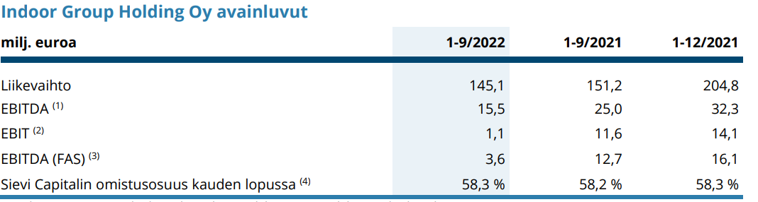 Edit: Keskon myydessä Sotkan ja Askon viimeisimmässä tilinpäätöksessä vuonna 2016 Indoor Groupin liikevaihto oli 187 MEUR ja liikevoitto 9,8 MEUR.
