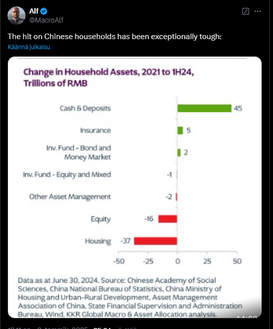 Alfin tviitti siitä, miten kiinalaiset kotitaloudet ovat kokeneet kovia viime vuosina. Asuntojen arvot ovat laskeneet merkittävästi ja osakemarkkinat ovat heikentyneet. Samaan aikaan säästöt ja talletukset ovat kuitenkin kasvaneet huomattavasti, mikä heijastanee varovaisuutta sijoittamisessa ja kotitalouksien siirtymistä turvallisempiin “kohteisiin”.