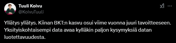 Kiina saavutti vuonna 2024 kuulemma 5 prosentin talouskasvun, mikä oli Pekingin tavoitteena. ![]()