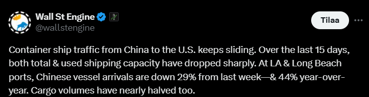 Viime viikolla aluksia oli 29 prosenttia vähemmän kuin edellisviikolla ja 44 prosenttia vähemmän kuin vuosi sitten. Myös konttien määrä laski ja merenkulkuvarustamot peruvat reittejä liittyen yleiseen tilauskatoon. Maansiirtokuljetukset romahtivat, kun 700 000 rekallista tavaraa katosi jne.