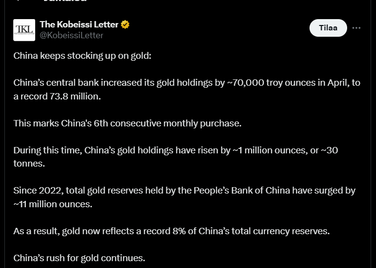 Kultaa on ostettu jo kuutena kuukautena peräkkäin ja ja vuoden 2022 jälkeen määrä on kasvanut noin 11 miljoonalla unssilla. Kulta kattaa alla olevan jutun mukaan tällä hetkellä ennätykselliset 8 prosenttia Kiinan valuuttavarannosta.