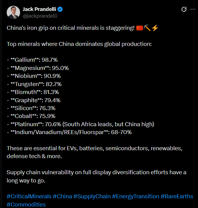 The tweet highlights a familiar issue: how China dominates the production of many critical minerals (in some cases up to 99 percent), which increases the vulnerability of technology sector supply chains.