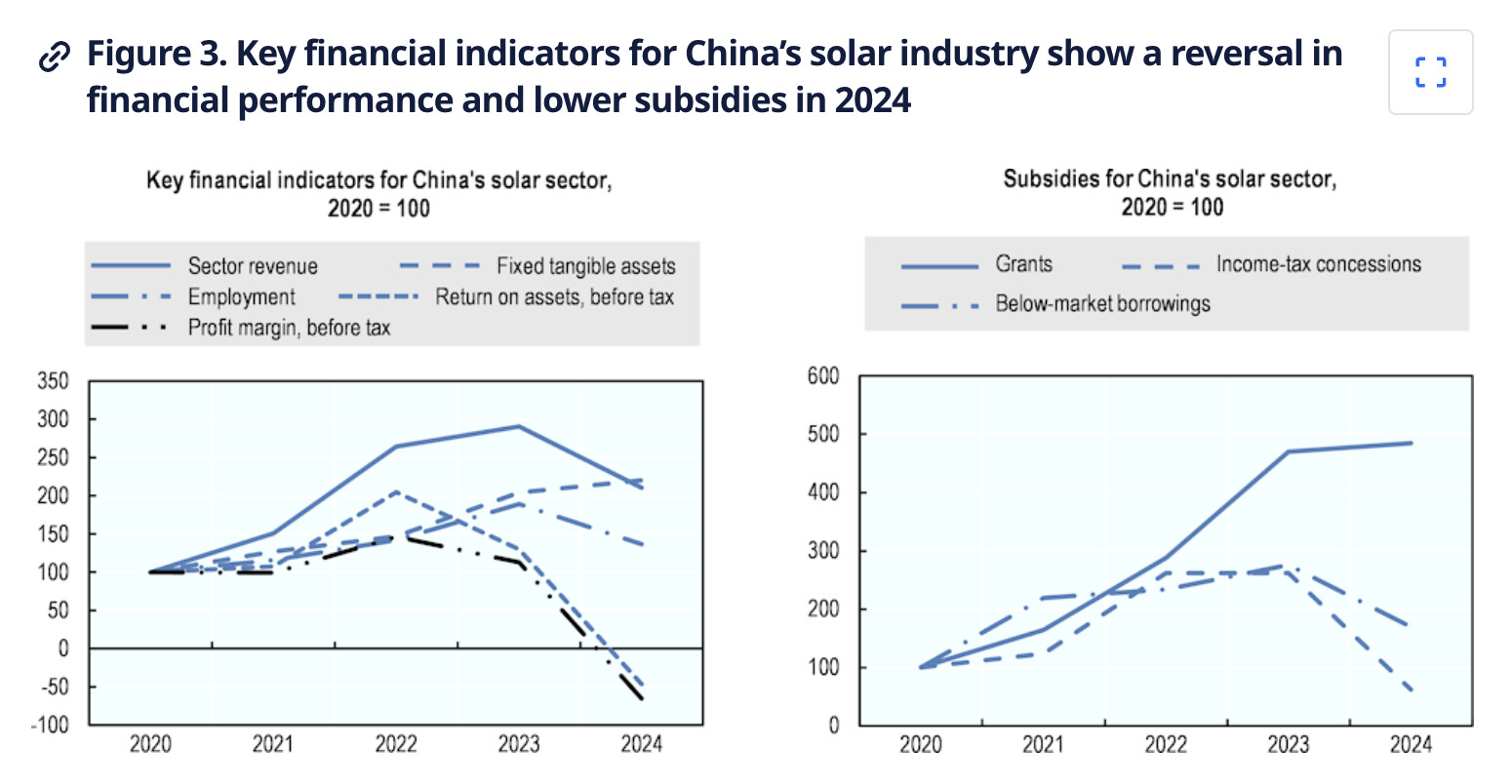 Excessive investment in solar manufacturing capacity exacerbated by large amounts of subsidies has increased concentration and undermined diversification of supply in the solar value chain. In 2023, Chinese module producers accounted for more than 90% of global shipments by volume, while OECD-based producers (e.g. based in Germany, Japan, and the United States) saw their combined share fall below 10%, down from 80% back in 2005.